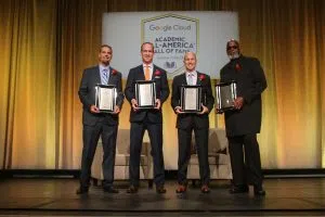 The 2018 four-person class was inducted on Thursday night during the Academic All-America Hall of Fame Induction Ceremony at the CoSIDA and NACDA convention in National Harbor, Maryland. Fellow inductees included San Jose State two-sport athlete and civil rights icon Harry Edwards, former Washington State kicker and 21-year NFL veteran Jason Hanson, and former FIU and major league baseball player Mike Lowell.
