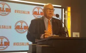 University of Tennessee Athletics Director and UT Medical Center President/CEO Joe Landsman spoke to the media Monday to announce and describe the inaugural ALL IN Against Alzheimer’s effort to benefit the Alzheimer’s Research Initiative.