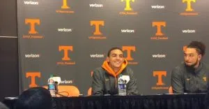 Tennessee QB Jarrett Guarantano spoke to the media in the postgame after the Vols 24-7 win over the Kentucky Wildcats. Vols QB Jarrett Guarantano (L) & TE Dominick Wood-Anderson (R) / Credit: WNML Staff