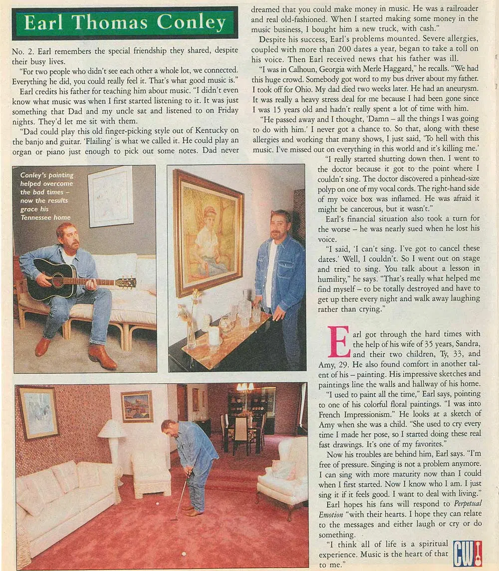 NCD combed its archives and found an interview with Earl from the April 7, 1998, issue of Country Weekly magazine, penned by Wendy Newcomer with photos by Tim Campbell.