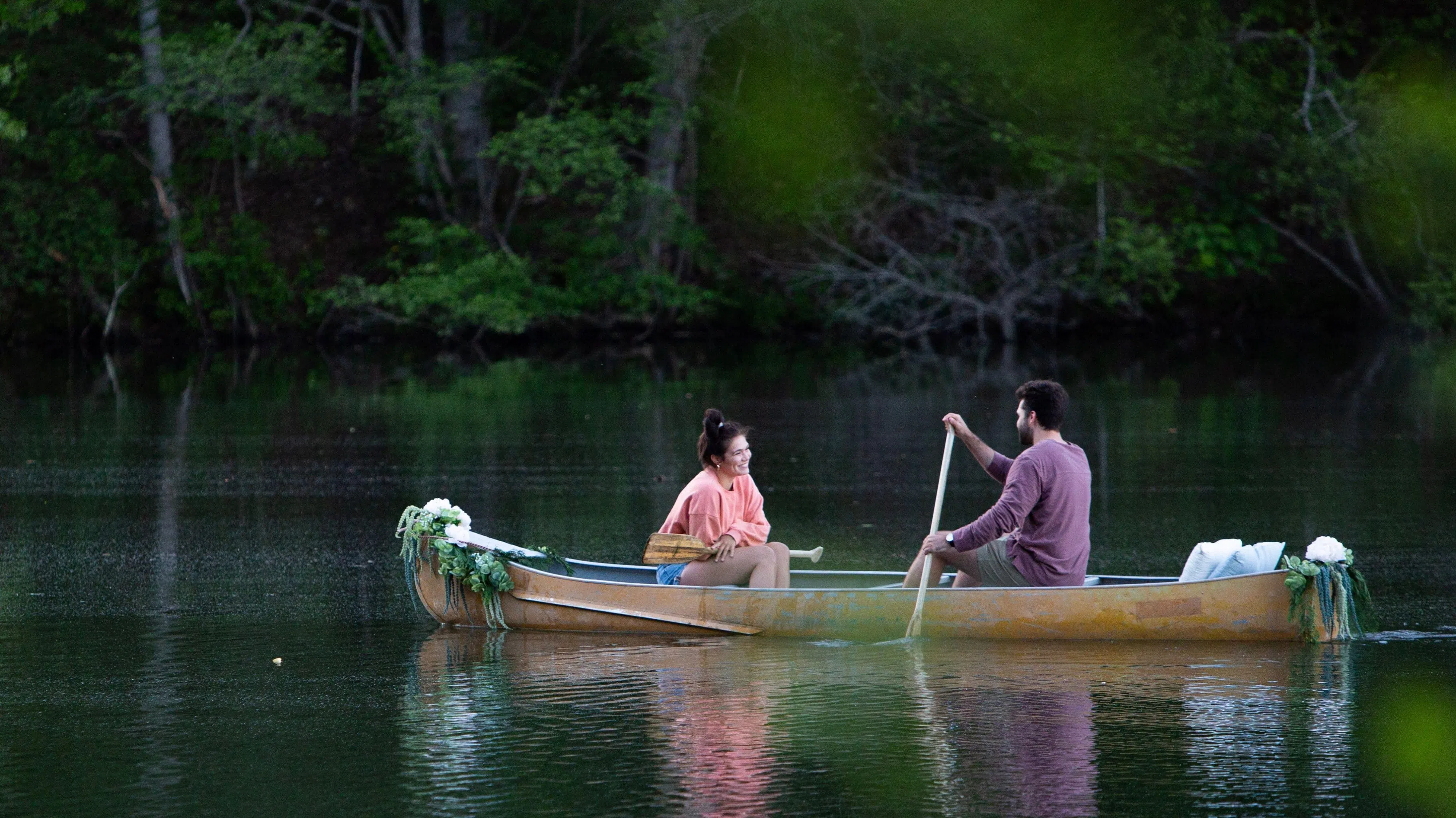 Tyler proposed to Abby during an evening canoe ride in a lake in Georgia, where the couple has been quarantining. Tyler got down on one knee and presented Abby with a ring made of wildflowers (until the jeweler opens back up and they can design her ring).