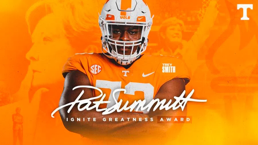 KNOXVILLE, Tenn. — Tennessee offensive lineman Trey Smith added another accolade to an illustrious Vol career, as the Greater Knoxville Sports Hall of Fame announced he will be presented with the Pat Summitt Ignite Greatness Award at the 39th Annual Greater Knoxville Sports Hall of Fame Induction Ceremony.