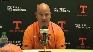 Tennessee head coach Jeremy Pruitt spoke to the media in the postgame press conference after Tennessee’s 42-17 win over Vanderbilt in Nashville. Vols HC Jeremy Pruitt / Credit: UT Athletics