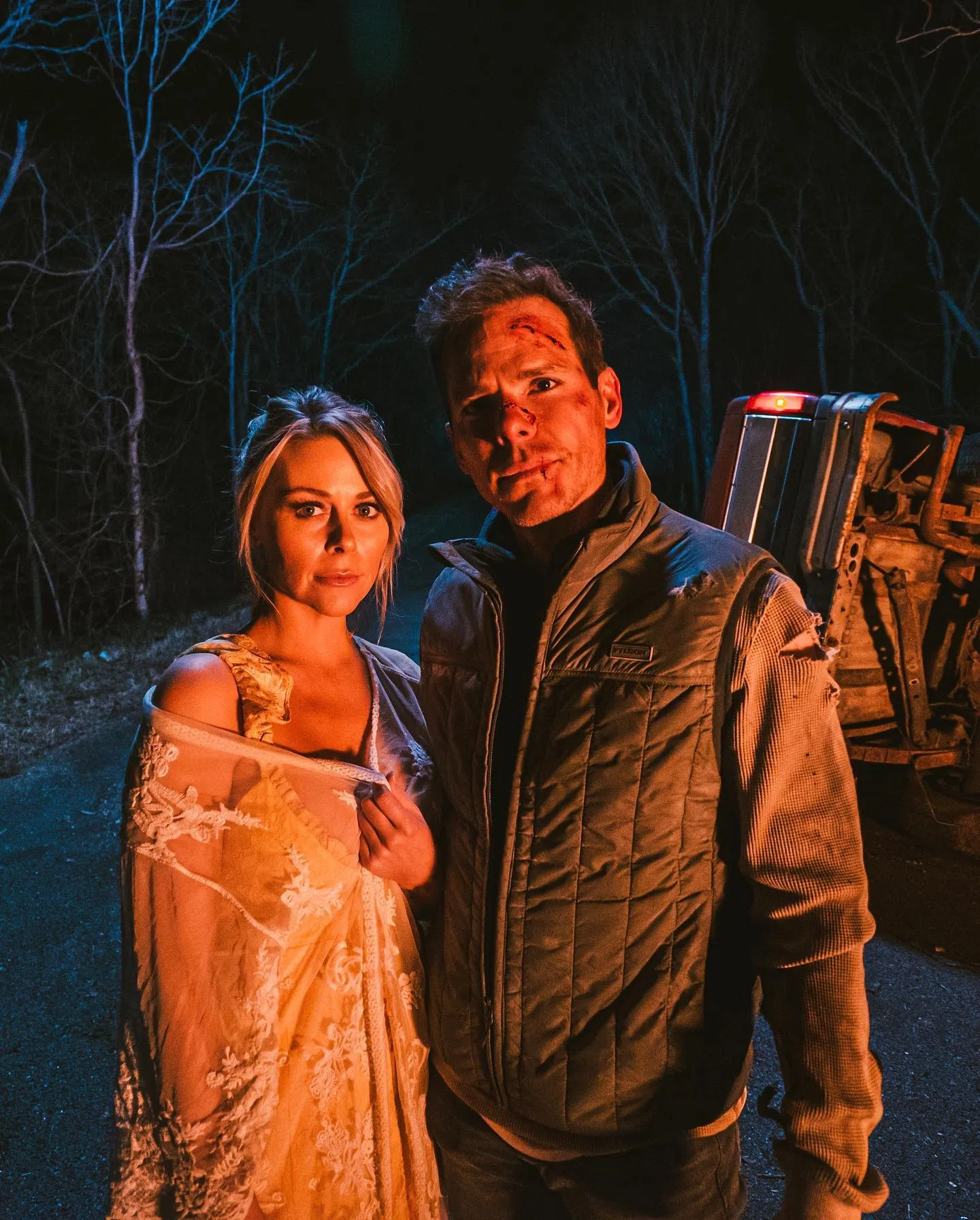 Posting this picture from the video shoot Granger said, “Here’s a good representation of our marriage. Me beat up, tired, ripped, bloody and burned. Amber flawless and composed.”