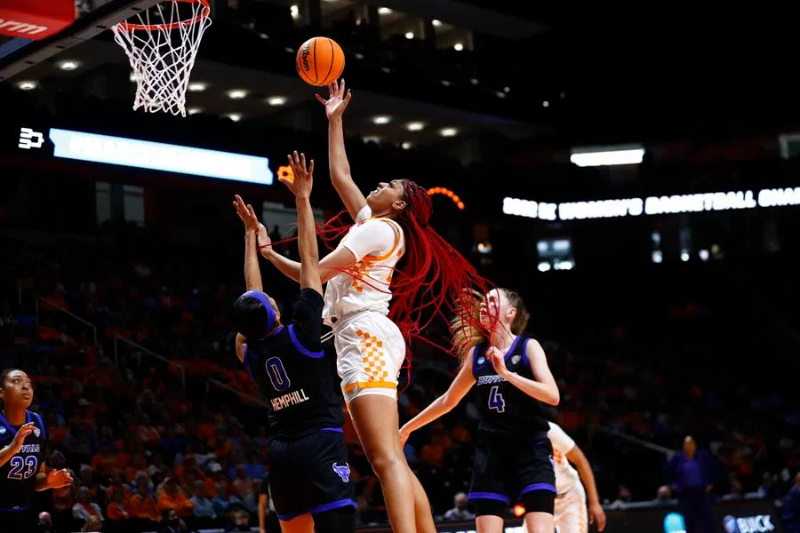 Woolley added another trey to start the second, stretching Buffalo’s lead to five points before Key converted on an old-fashioned three-point play on the other end. Key reclaimed the lead for Tennessee a minute later, and Dye followed it up with a 10-foot jumper on the next play to put UT ahead 23-20 with 7:20 left in the half. Loren Christie ended the drought for UB, hitting a jumper to set off a 6-2 run that gave the Bulls a one-point advantage two minutes later. The teams traded baskets for the next four minutes until Walker and Brooklynn Miles scored layups on back-to-back possessions to give UT a three-point lead with 1:30 to go. In the closing seconds, Summer Hemphill added a pair of free throws for Buffalo, and Walker hit one for UT, giving the Lady Vols a 32-30 lead at the half.