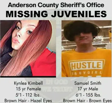 15 year-old Kynlea Kimbell and 17 year-old Samuel Smith ran away from a home in Anderson County.