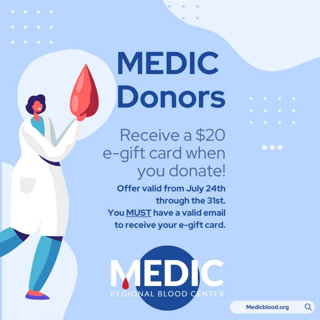Medic Regional Blood Center offering donors a $20 E-Gift Card.