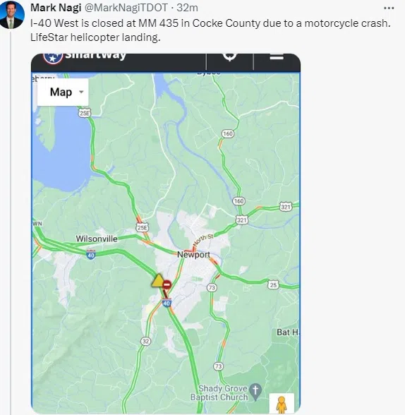 TDOT officials confirm I-40 West at Mile Marker 435 in Cocke County is closed and that the crash involves a motorcycle.