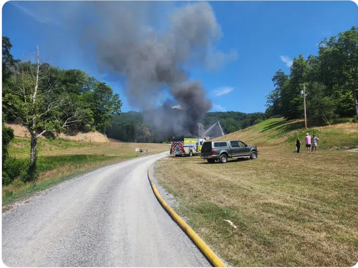 Crews were called to a structure fire Saturday morning in the 9300 block of Pedigo Road and found a “huge structure fully engulfed in flames on one end.”