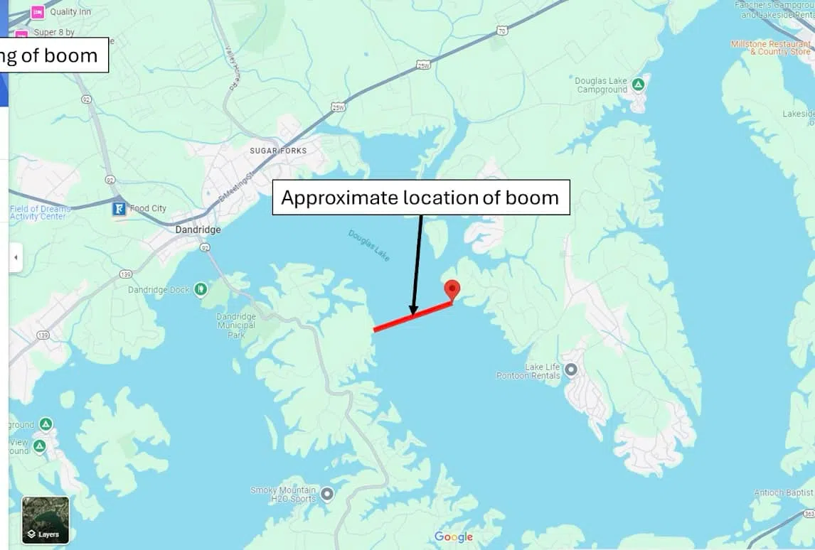 The boom extends across the entire lake surface at Mile 11 at Swanns Shoals upriver from downtown Dandridge and will be in place until further notice. Deployment of the boom is intended to help protect water supply intakes and other infrastructure downstream of the debris mat and ensure TVA’s ability to continue flood control and normal operations at Douglas Dam.