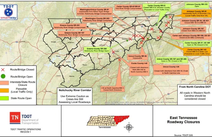 Please go to https://www.tn.gov/tdot/projects/projects-region-1/hurricane-helene-recovery.html for updates on East Tennessee Roadway Closures.