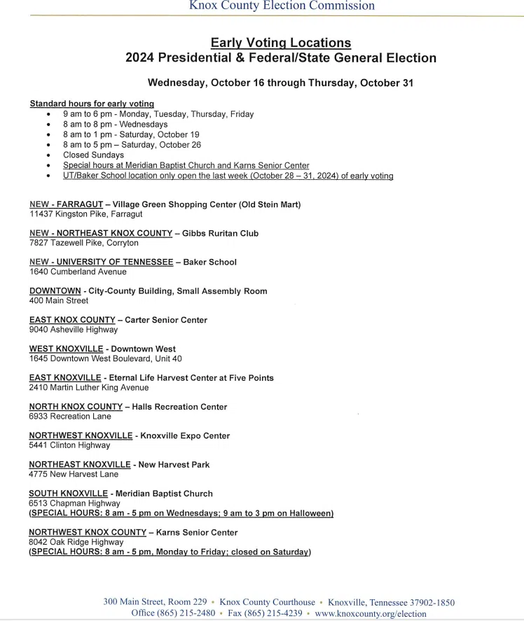 If you’d like participate in early voting, please go to https://www.knoxcounty.org/election/ to view times and a sample ballot or to get more information.