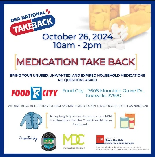 Knoxville, TN (WOKI) In coordination with DEA National Prescription Drug Take Back Day, the Knoxville Police Department and Metro Drug Coalition are teaming up for a medication take back event this weekend.