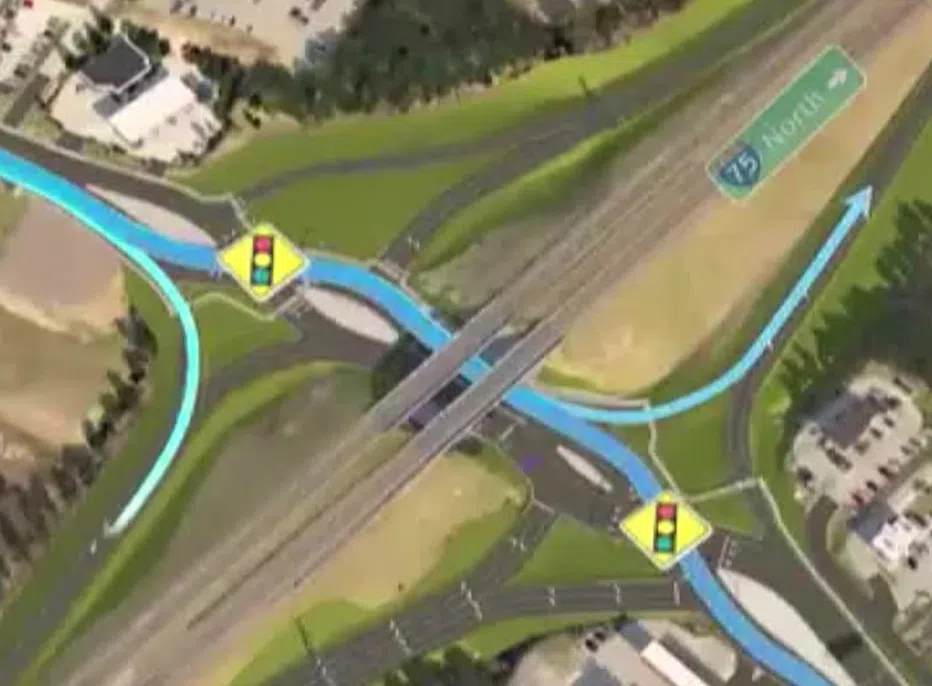 He says Motorists driving either eastbound or westbound will navigate through two traffic signals and perform crisscross maneuvers. While motorists going westbound can go straight through the interchange or access southbound or northbound I-75.