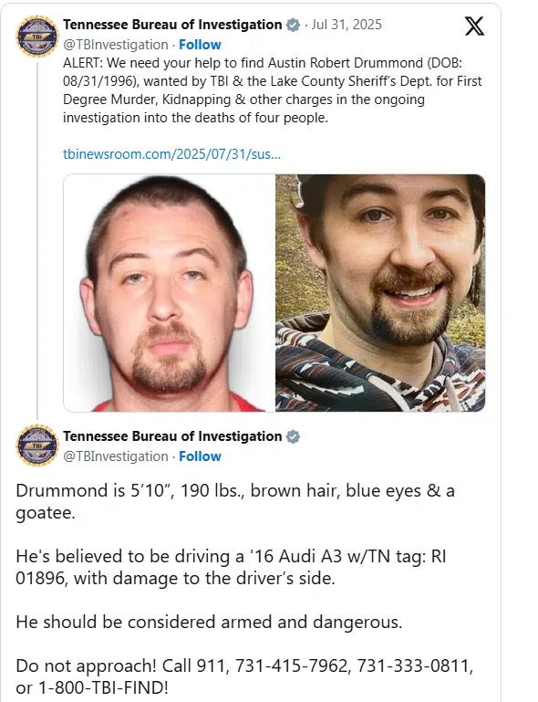 “At this time, Drummond remains at large and should be considered armed and dangerous,” the TBI said. “Anyone with information concerning his whereabouts is asked to call 731-415-7962, 731-333-0811, or 1-800-TBI-FIND.”