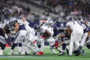 Arlington, TX – November 5, 2018 – AT&T Stadium: Derrick Henry (22) of the Tennessee Titans during a regular season Monday Night Football game (Photo by Allen Kee / ESPN Images) By Vin...