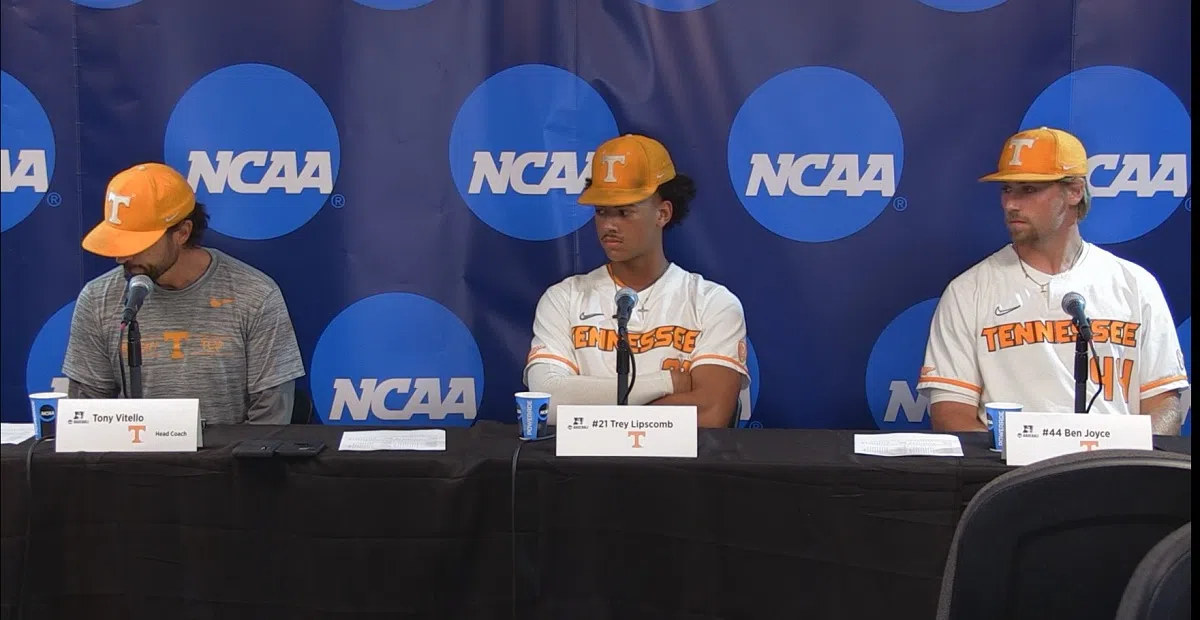 Tennessee head coach Tony Vitello, third baseman Trey Lipscomb and right handed pitcher Ben Joyce spoke to the media Friday after Game 1 of the Super Regionals, a 8-6 loss to Notre Dame.https://youtu....