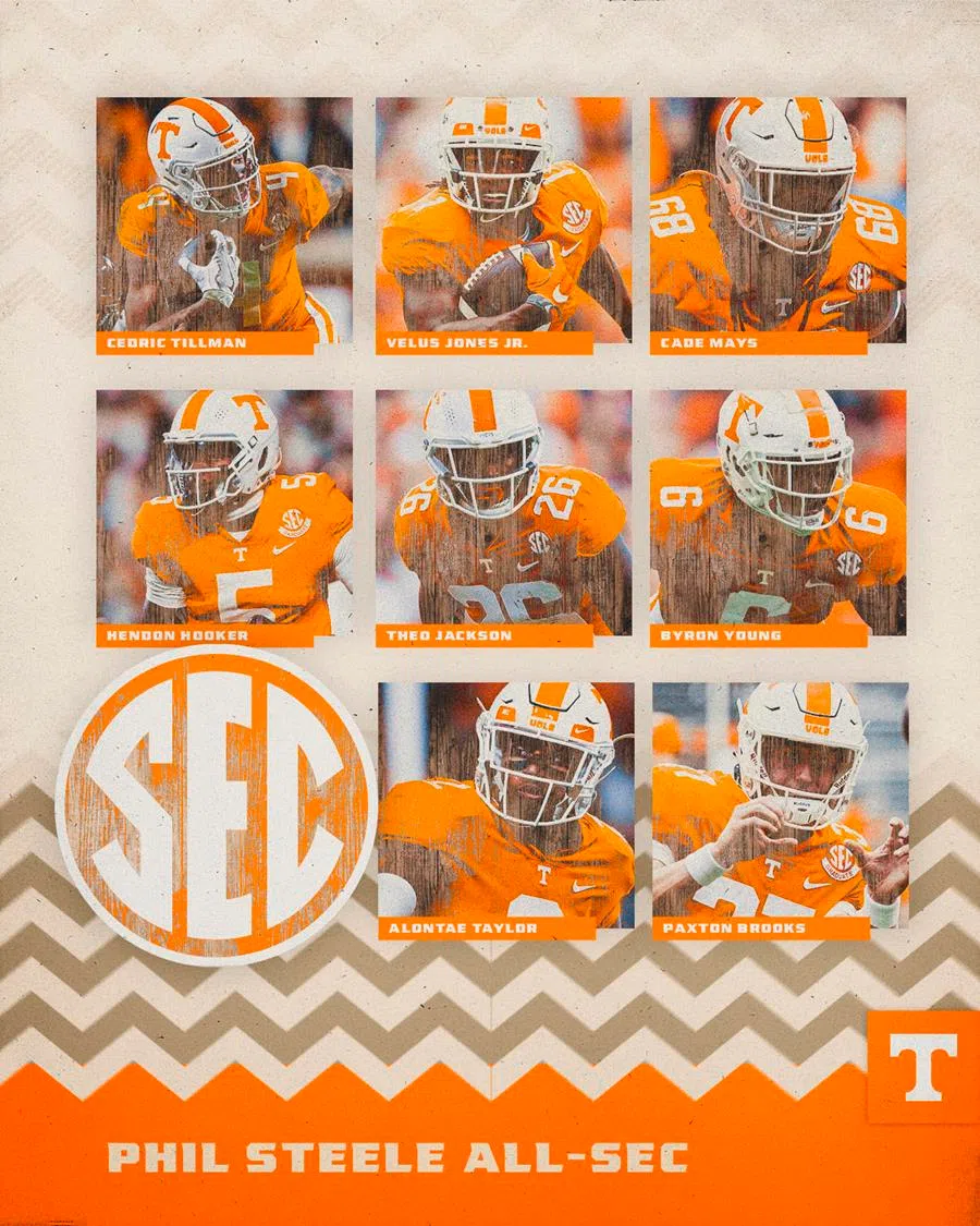 KNOXVILLE, Tenn. - Tennessee had eight players earn recognition on Phil Steele’s postseason All-SEC teams, led by redshirt senior wide receiver and return specialist Velus Jones Jr., w...