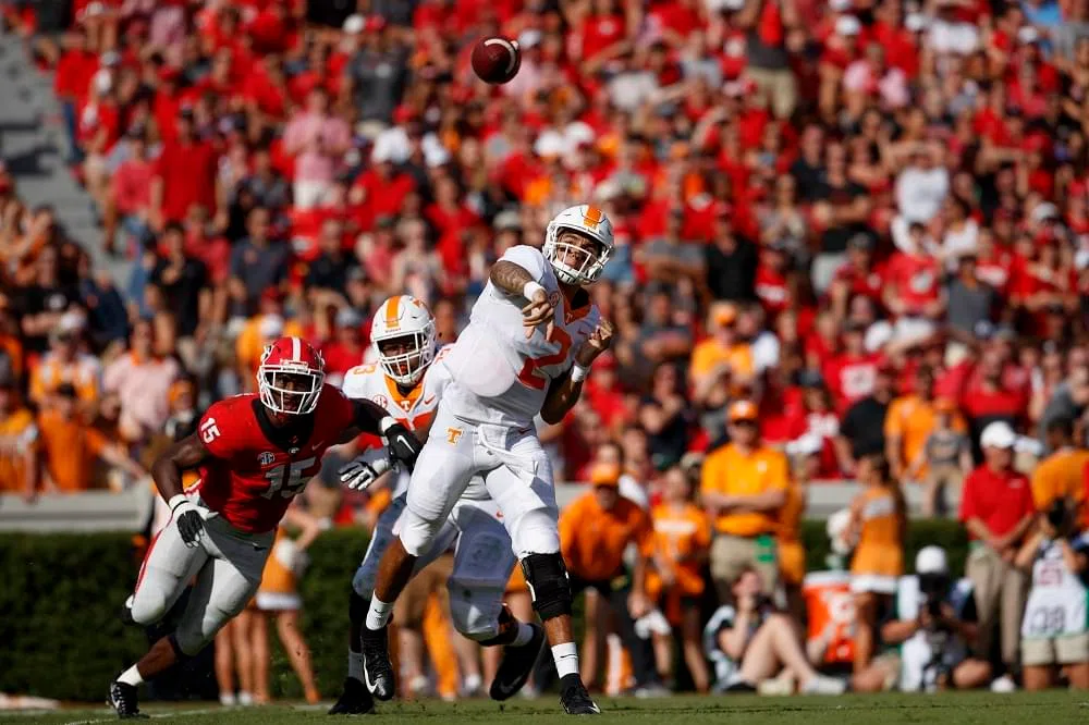 ATHENS, GA – SEPTEMBER 29, 2018 – Quarterback Jarrett Guarantano #2 of the Tennessee Volunteers during the game between the Georgia Bulldogs and the Tennessee Volunteers at Sanford Stadium...