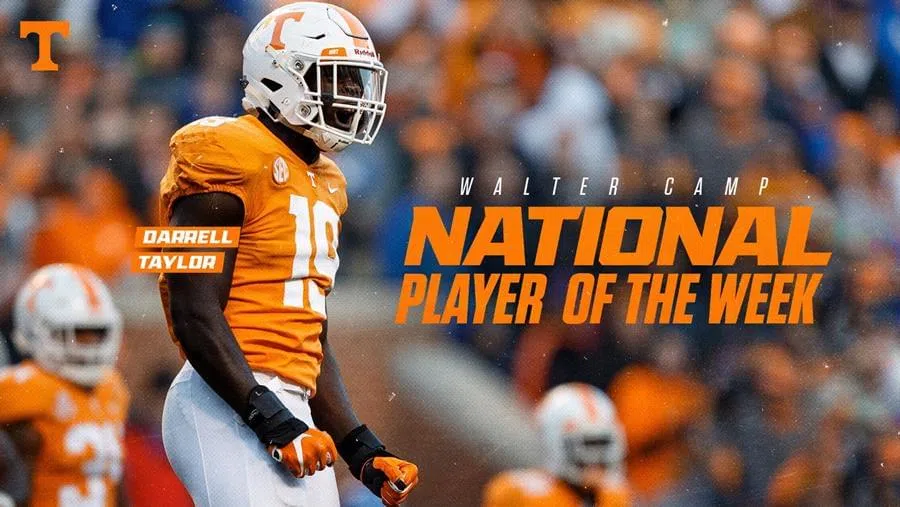 Credit: UT AthleticsNEW HAVEN, Conn. - Tennessee redshirt junior outside linebacker Darrell Taylor was named Walter Camp National FBS Defensive Player of the Week on Sunday following his outstanding f...