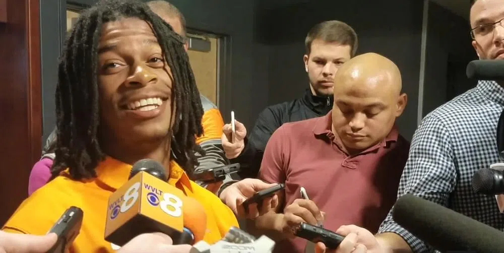 Tennessee defensive back Baylen Buchanan spoke to the media in a group setting Monday of Charlotte week. https://youtu.be/IS7ITGGLRII Vols DB Baylen Buchanan / Credit: WNML Staff