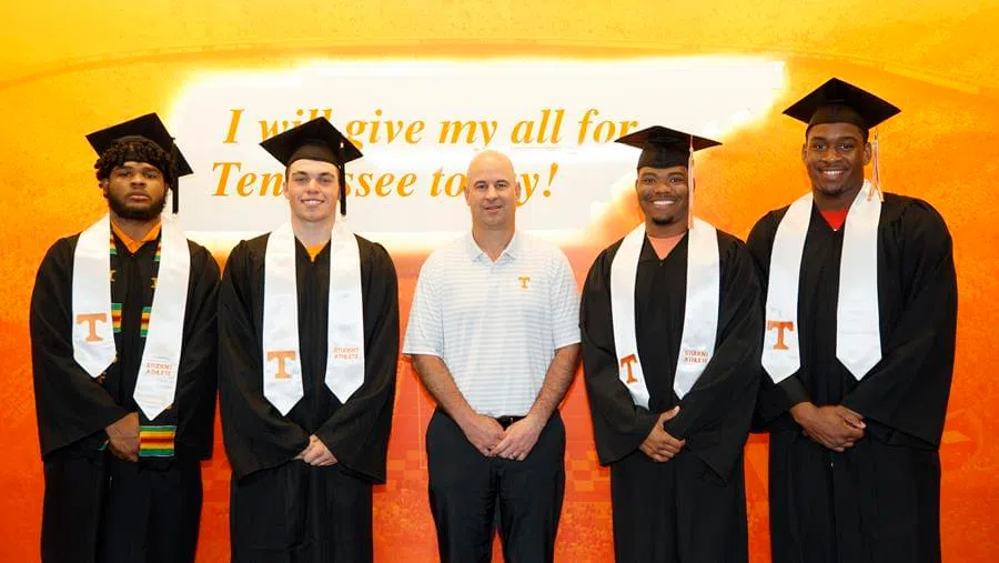 Tennessee Football graduates with coach Jeremy Pruitt / Credit: UT Athletics KNOXVILLE, Tenn. - Led by the Southeastern Conference's male scholar-athlete of the year and six Vols expected to suit up t...